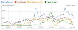 En el gráfico superior aparecen las estadísticas de visitantes a las respectivas webs. Curioso que la que más visitantes recibe es la que menos ha facturado del top3, ¿falla la fidelización? ¿falla la disponiblidad de productos? ¿falla la generación de espectivas? Sea lo que sea, las cifras que mueven estos outlets son más que considerables, veremos como va el 2009 y si formamos parte o no de la facturación 😉