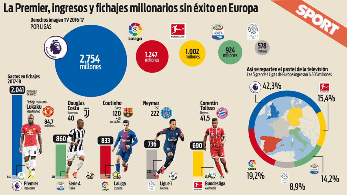 La Premier League es la competición de clubes más reconocida del mundo, la mejor pagada y la que suele dominar el mercado de fichajes. El PSG (Neymar) y el Barça (Coutinho, Dembélé) tomaron el relevo al Real Madrid (Cristiano, Bale) en los traspasos más caros, pero son los clubes ingleses los que dominan el mercado de fichajes, año tras año, en volumen global. Sin embargo, ese poderío económico no se traduce en dominio deportivo.