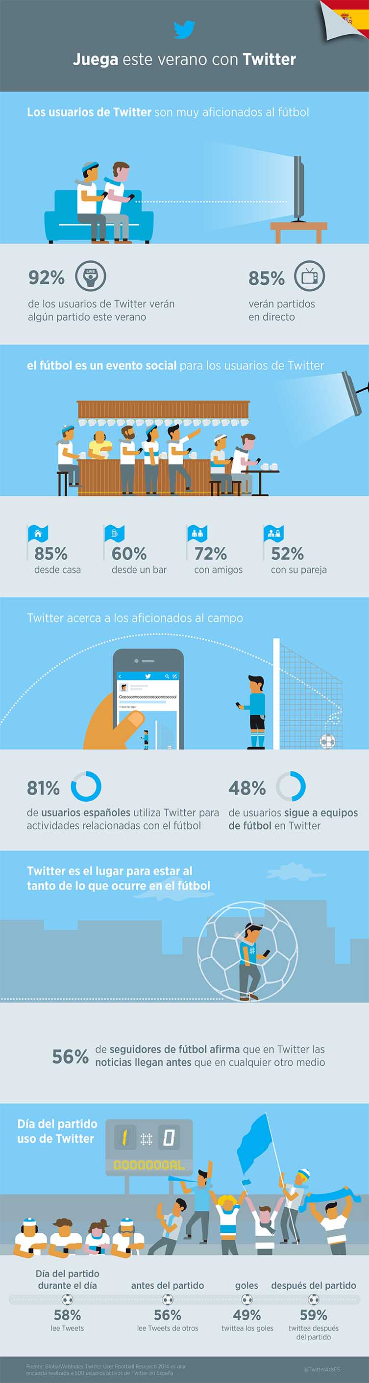 Entre los datos más interesantes, destacar que más del 50% de la audiencia, twittea antes, durante y después del partido de su selección, un porcentaje impensable hace unas temporadas. Para más del 55% de los seguidores de fútbol afirman que en Twitter las noticias llegan antes que en cualquier otro medio. Estos y otros interesantes datos los podéis ver en esta infografía.