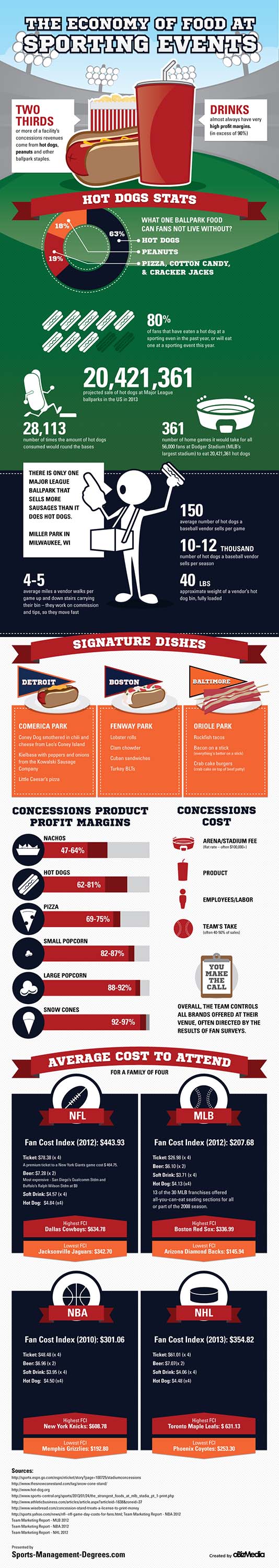 Queda claro que para los americanos el deporte se convierte en un espectáculo que se va a disfrutar durante lo que dura los partidos. Según la infografía el gran ganador son los hot dogs, de todas maneras también existen otros interesantes datos. Recomendable dar un rápido vistazo 😉