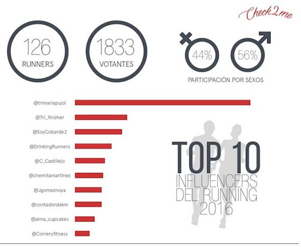 La triatleta sevillana Maria Pujol – @trimariapujol sucede a Cristina Mitre (número uno en 2015) en lo más alto del ranking de influencers del mundo del running. Por detrás suyo, a gran distancia, completan el podio el atleta popular Mario – @tri_finisher y el blog de atletismo SoyCobarde –@soycobarde2.