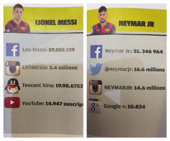 El jugador brasileño Neymar Jr, ya supera (en el total de seguidores) a Lionel Messi en seguidores en las Redes Sociales. En la siguiente imagen se pueden ver, aunque evidentemente ha día de hoy ya han aumentado, los seguidores y la presencia que tienen ambos jugadores en las Redes Sociales.