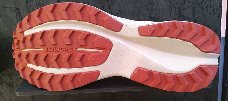 La suela, con el sistema PWRTRAC, nos asegura un muy buen agarre en terrenos, eso sí, que no sean muy técnicos y con gran presencia de caucho en aquellas zonas de mayor contacto con la superficie (delantera y trasera de la suela).